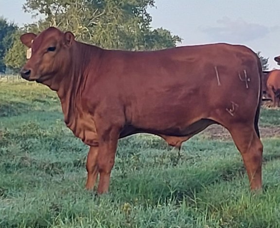 DiamondJ Tesla, Red dehorned Heifer, born 12/5/21. Her parents are Jet 6/9 x Cassie Diamond J.